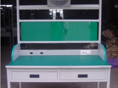 详细信息 防静电工作台,选郑州泽恒,AAA级信誉,货比三家不吃亏 **【产品名称】:防静电工作台 **【规格参数】:常规双面2400L×1200W×1800H(mm) ****具体大小可按照客户要求定做,详情请联系泽恒详谈。 **【产品材质】一,支架采用优质40*40mm无缝优制钢管,表面经过除锈、磷化、静电喷塑、高温固化等工序。具有防水、耐磨、耐高温功能。大大增强台面的承重能力;桌脚配有防护套,防防止噪音和地板刮伤二,工作台采用15mm密度板制作表面铺有防静电胶皮,胶皮的厚度是2mm,半圆木线包边。三, 副台面宽度300mm,离桌面的高度是450mm。 四,两P空气开关,电源插座采用3位多功能安装在物料台下面每个板2个插座,线槽4分胶。五,灯架采用30*30铁方通,照明采用T5节能灯,每边安有2支。六,作业指导书采用H型铝合金制作跑道,每个工位配有A4胶片一个。七,工作台整体采用电脑白色处理。 **【特点】:产品具有耐冲击、抗老化、抗氧化等特点,方便清洁、色调鲜明,完全符合国际环保要求。 **【适用场所】:学校实验室、电子厂、仓库储藏、电工等场所。